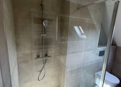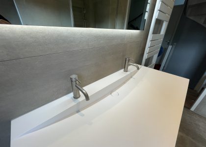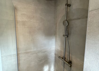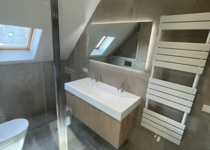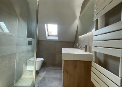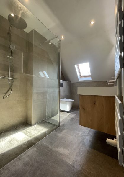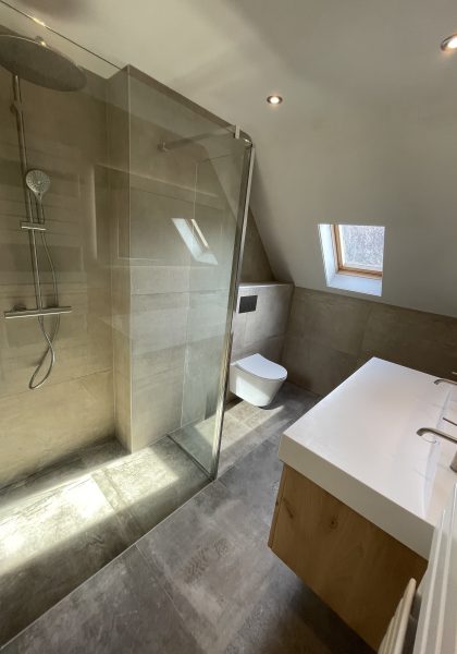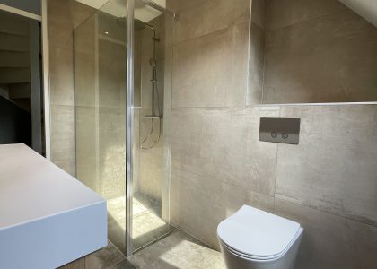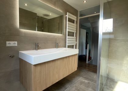 Mooie grote Tegels 120x60 op de wand, en 60x60 op de vloer. Uniek Massieve eiken meubel combinatie met dubbele rvs kranen. Grote inloopdouche met een Stortdouche. Glazenwand met draaideel. Verlaagd plafond met inbouwspots. Toilet is in zelfde style uitgevoerd als de badkamer.
