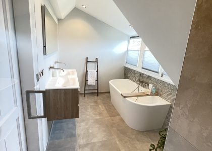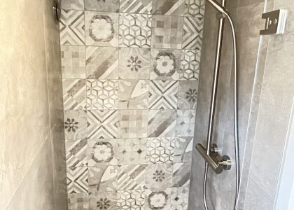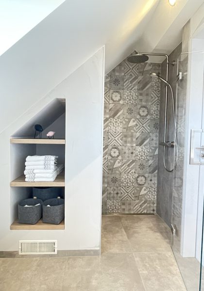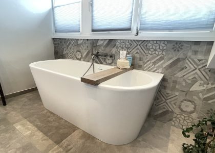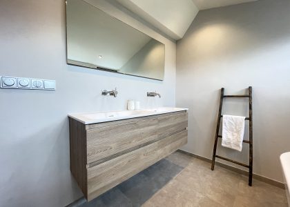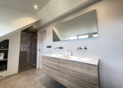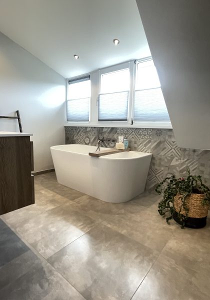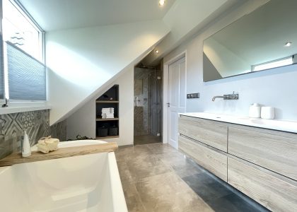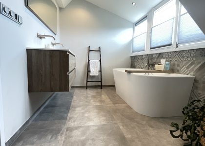 Badkamer en toilet renovatie uitgevoerd. Mooie grote tegels 60x60, en assorti tegels. Inloopdouche met glazen deur. Groot meubel met dubbele inbouwkranen. Half vrijstaand bad met inbouwkraan. Badkamer is deels gestuct met betoncire. Toilet is uitgevoerd in dezelfde style. Mooi strak geworden.