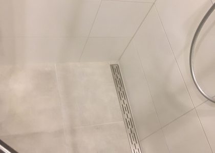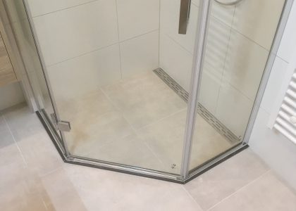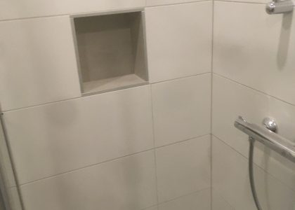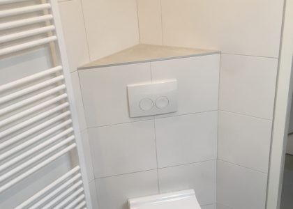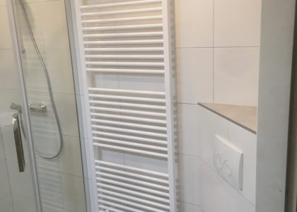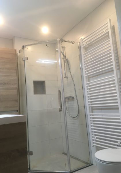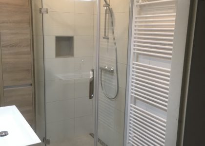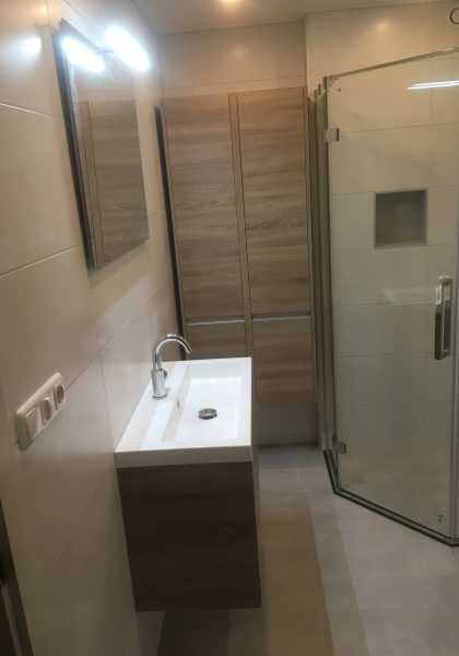 Compacte badkamer, waar alles in zit. Tegels 30x60 , vloertegels 60x60. Inloopdouche met shampoo nis en douchecabine. Hang toilet met design pot, meubel met extra kast werk. Verlaagd plafond met spots. Mooi compacte badkamer die alles te bieden heeft.