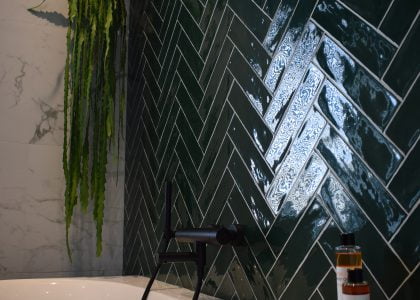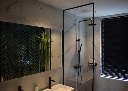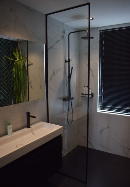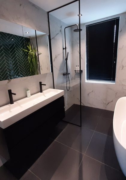 Mooie moderne badkamer geworden. Groot meubel met zwarte kranen. Marmer look Tegels, vissengraad muur met een half vrijstaand bad. Verlaagd plafond met spotjes. Maatvoering en indeling perfect voor de ruimte.