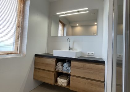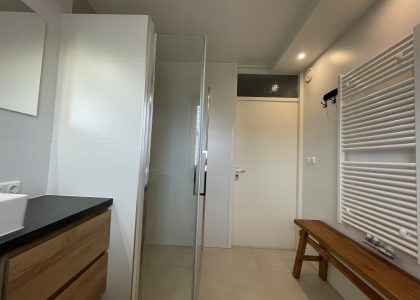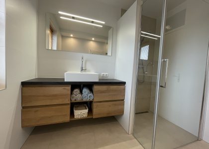 Mooie badkamer geworden, praktisch en stijlvol. Grote inloopdouche, met nis. Design toilet, en een design radiator. Een opmaat meubel tussen de muren in, met losse was kom een eye catcher. Grote Spiegel met verlichting. Wanden met witte 30x60 tegels, en op de vloer een 60x60 taupe tegel. Koof in het plafond gemaakt met spotjes. Geslaagd project weer.