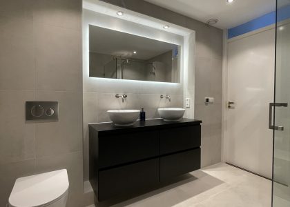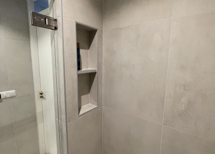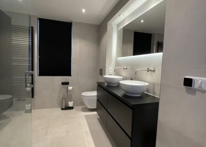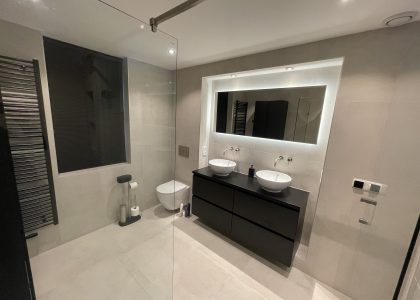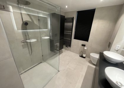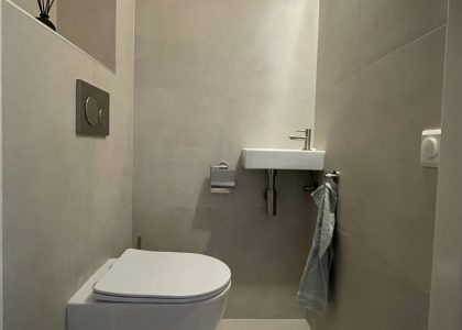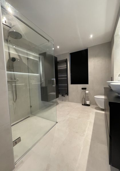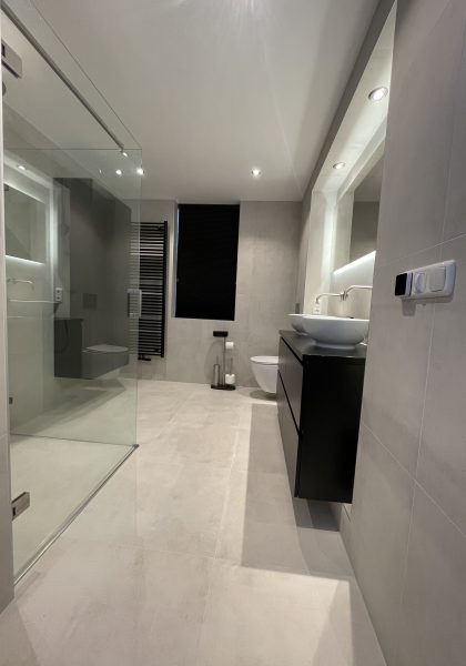 Badkamer en toilet met 60x60 tegels zowel op de wand als vloer. In de badkamer een koof gemaakt met spots, met een nis voor het meubel.