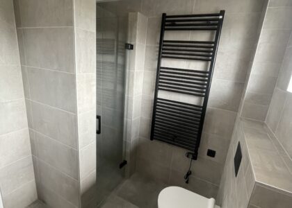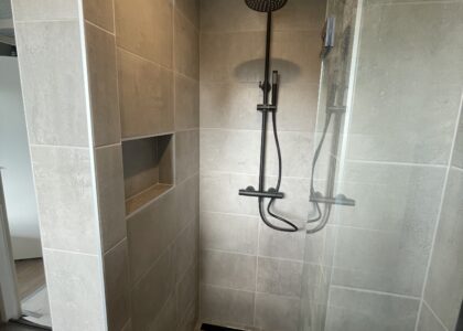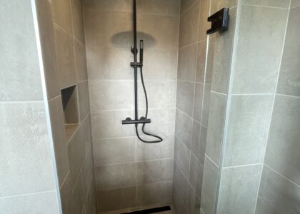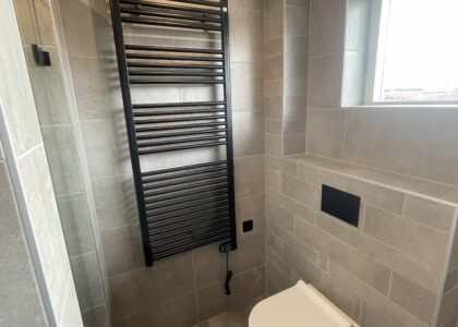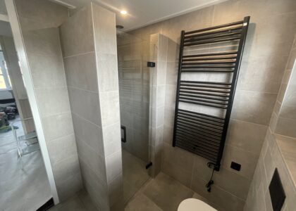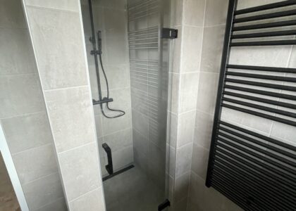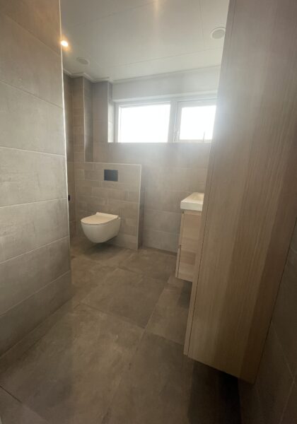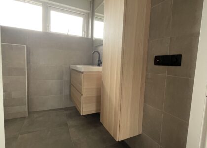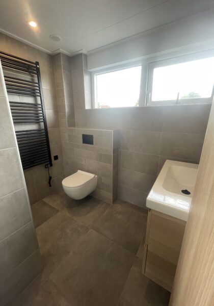 Mooie badkamer met 30x60 tegels, op de wand en 60x60 op de vloer. Compacte badkamer met toch alle gemakken voorzien.