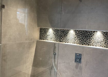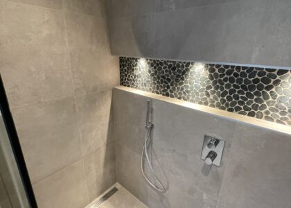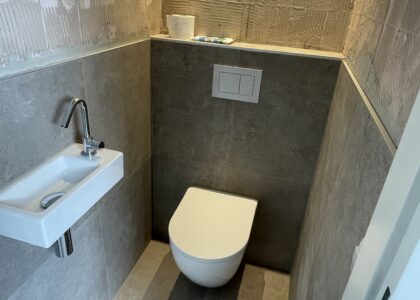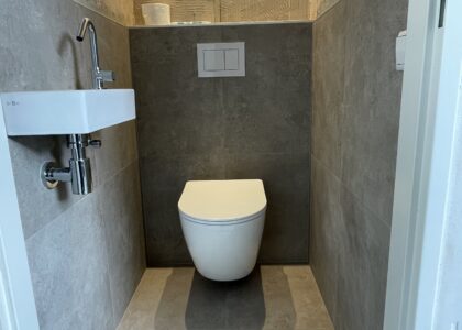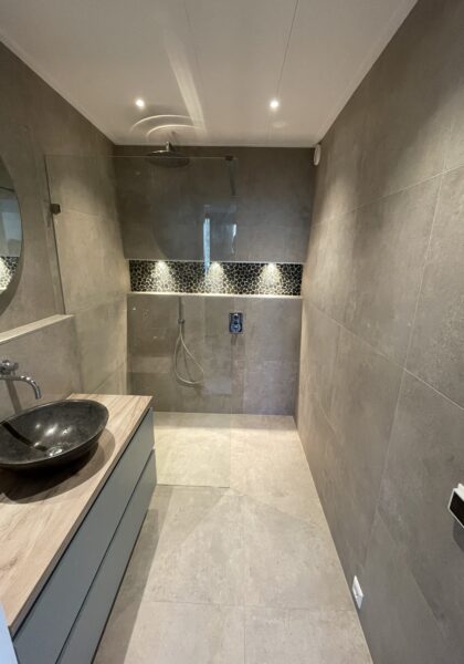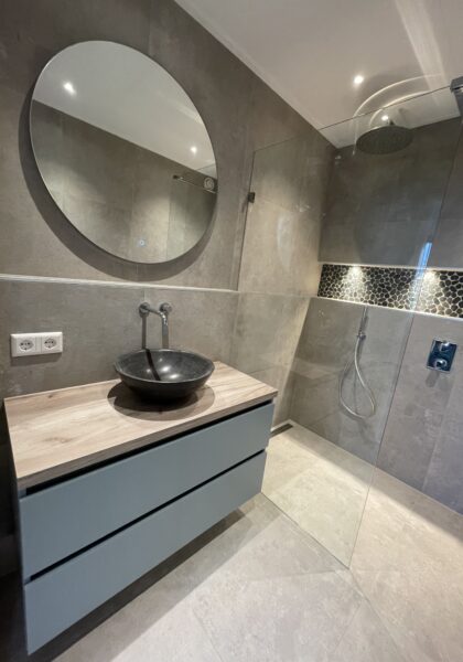 Compacte badkamer, met 60x60 op de wand en vloer. Verlichte shampoo nis, met assorti tegel. Inbouwkranen in de douche en bij het meubel. Meubel met een losse waskom en ronde spiegel. Verlaagd plafond met spots. Vloerverwarming en voorbereiding voor een elektrische radiator in de toekomst. Toilet ook uitgevoerd met een 60x60 tegel, Design wc pot, en fontein. Leuke sfeervolle badkamer en toilet geworden.