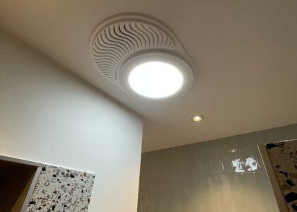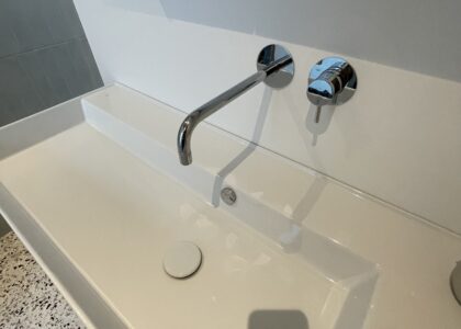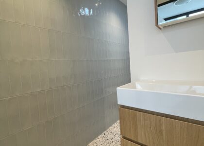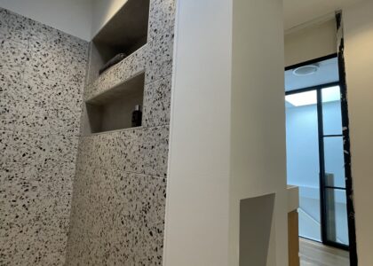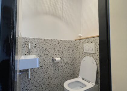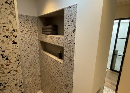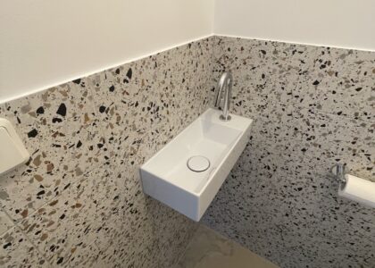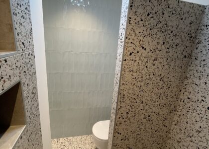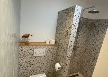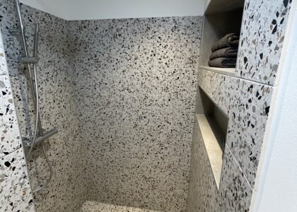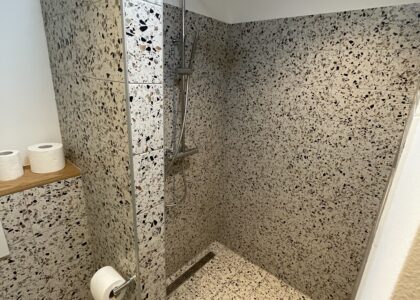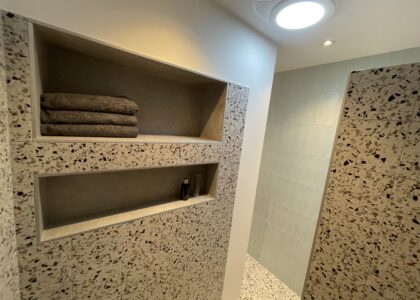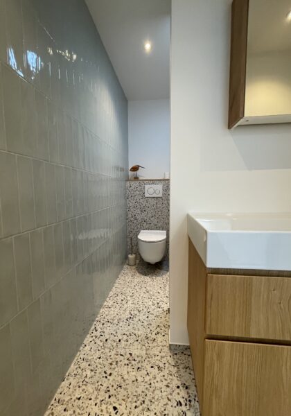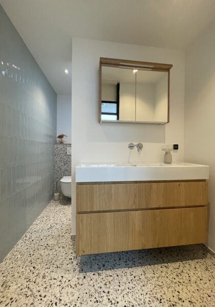 Speciale badkamer met speelse indeling. Kleine tegels 20x20 op de wanden met de lange muur glazuurde tegels. Alles Op tegelmaat gemaakt. Grote inloopdouche, met nis. Zeer leuke speelse badkamer geworden.