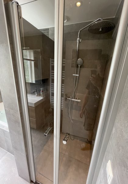 Badkamer met inloopdouche , whirlpool, 100cm meubel combinatie. Met 60x60 tegels op de wand en vloer en achterwand assorti tegels. Verlaagd plafond met spots. Mooie badkamer geworden.