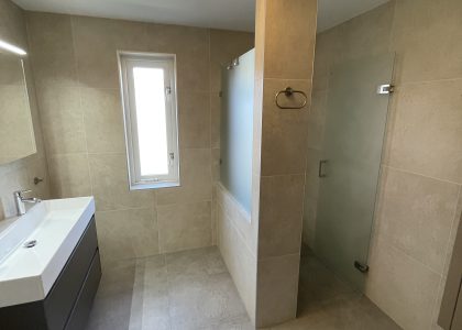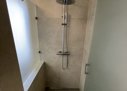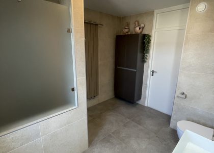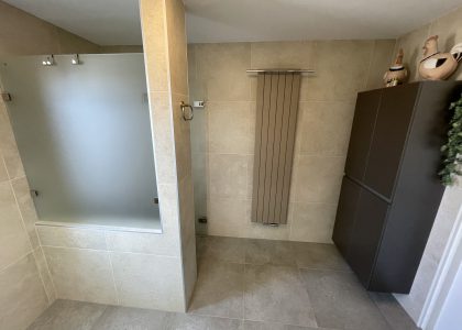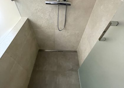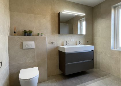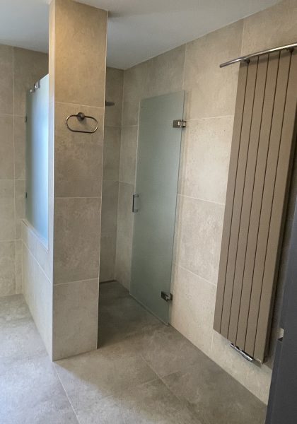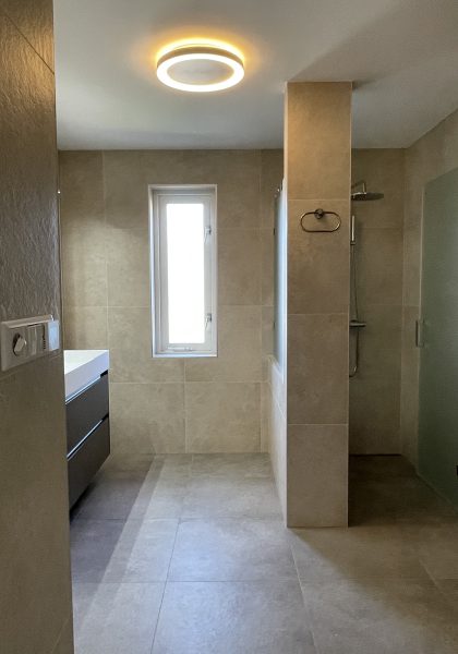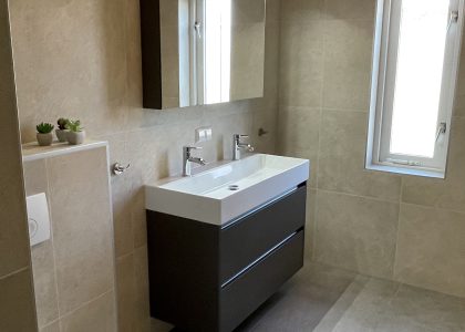 Badkamer renovatie uitgevoerd, met inloopdouche, badmeubel met dubbele kraan, design wc pot en radiator. Mooie tegels 60x60 op de vloer en wand. Mooie badkamer geworden.