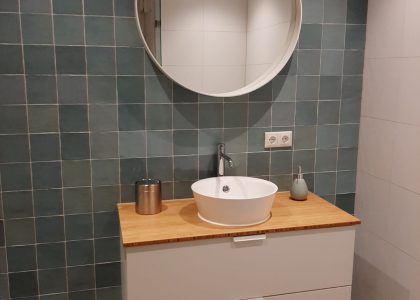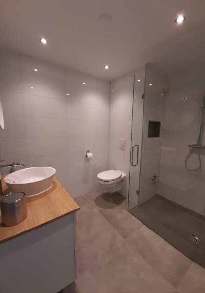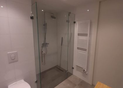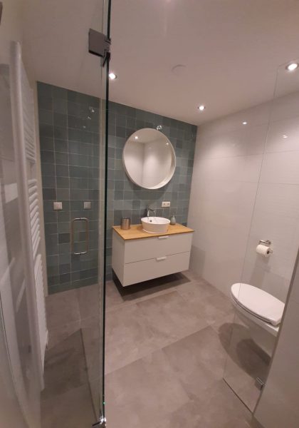 Badkamer stuk uitgebouwd. Een mooie ruime badkamer geworden, met een goede indeling. Tegels op de wand 30x60 en vloer 60x60. Mooi meubel met ronde spiegel. Grote inloopdouche met Nisje. Verlaagd plafond met spotjes. Mooie badkamer geworden.