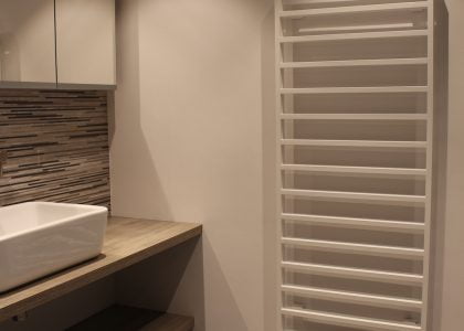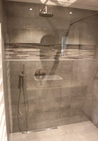 Complete badkamer en wc montage. Met inloopdouche, voorzetwand met inbouwkraan, shampoo nis. Badmeubelblad in combinatie met een losse bak en grote spiegelkast. Wanden met 60x60 tegel in combinatie met assorti strips,achter het meubel, en in de douche nis. Rondom een tegelstrip aangebracht Verlaagd plafond met spot. Wc ,met hang toilet, en verlichte nis. Mooi eindresultaat.